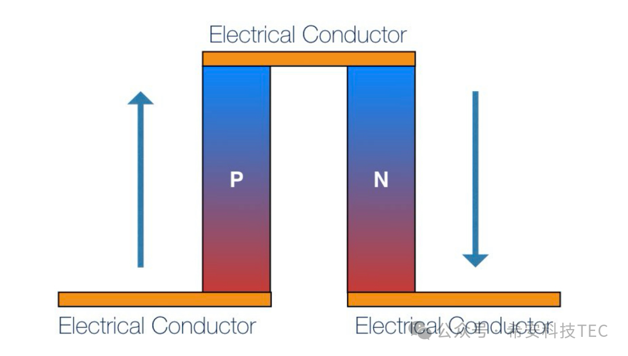 Když stejnosměrný proud prochází termočlánkem, polovodičová zrna typu P a typu N (typ P (dotovaný trojmocnými prvky, jako je bor, které mají otvory) vedou elektřinu otvory a stávají se kladně nabitými; Dvojice typu N (dotovaná pětimocnými prvky, jako je fosfor), která vede elektřinu elektrony a je záporně nabitá.