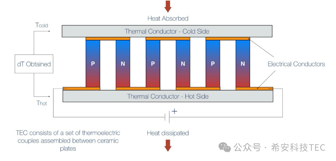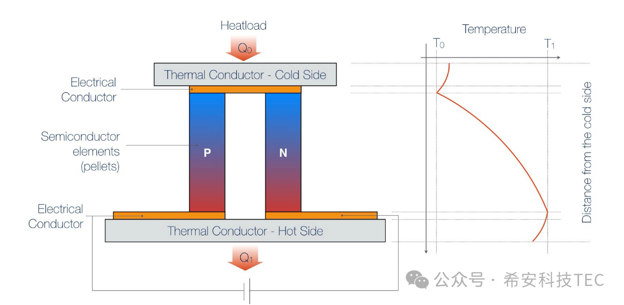Tepelné vodiče jsou přidány na oba konce termočlánku, jak je znázorněno na následujícím obrázku: vytvoří se kompletní TEC. Když je TEC napájen, horní povrch absorbuje teplo, které se nazývá studený konec, a absorbované teplo je Q0. Spodní povrch uvolňuje teplo a nazývá se horký povrch, přičemž uvolněné teplo je Q1 ; Q1= Q0+Qtec
